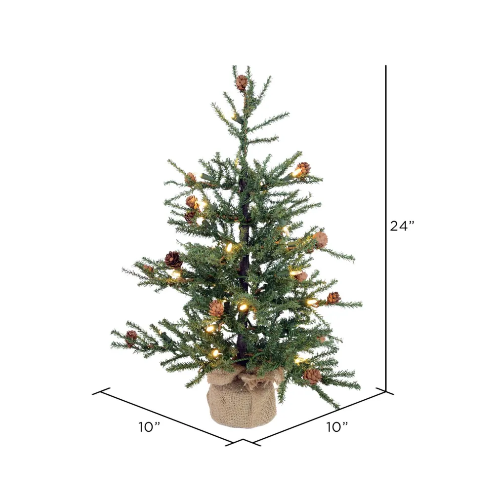 This Artificial Christmas Tree Adds A Natural, Festive Look To Your Holiday Decor. Its Compact Design Stands 24″ Tall, Making It Ideal For Placing On Any Surface In The Living Room Or Dining Room. This Faux Pine Tree Is Crafted From Pvc (Polyvinyl Chloride) With A Green Tone, And It Features 1241 Branch Tips Flanked By Pinecones. The 480 Clear White Lights That Adorn This Tree Bring A Bright And Traditional Look To Your Space, While An Electric Plug-In Makes It Easy To Turn Off And On. Plus, The Stand On This Tree Is Wrapped In Brown Burlap Material For A Rustic Touch.