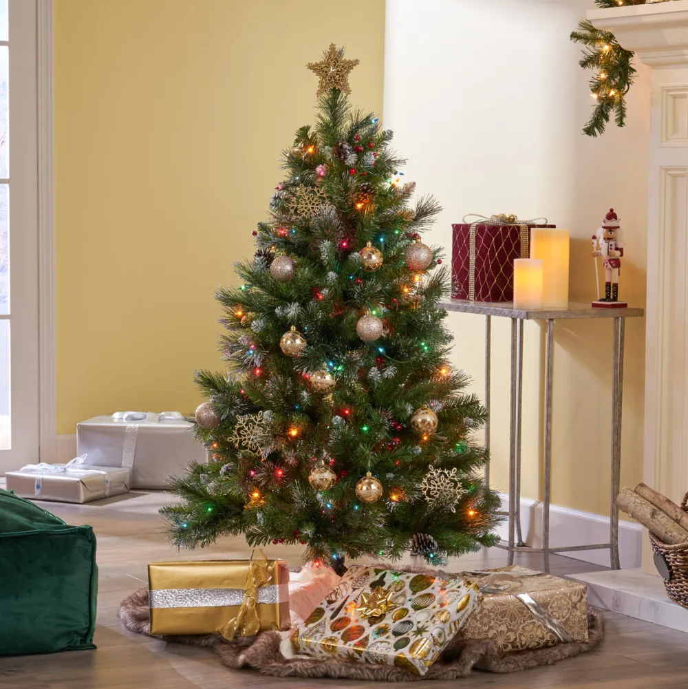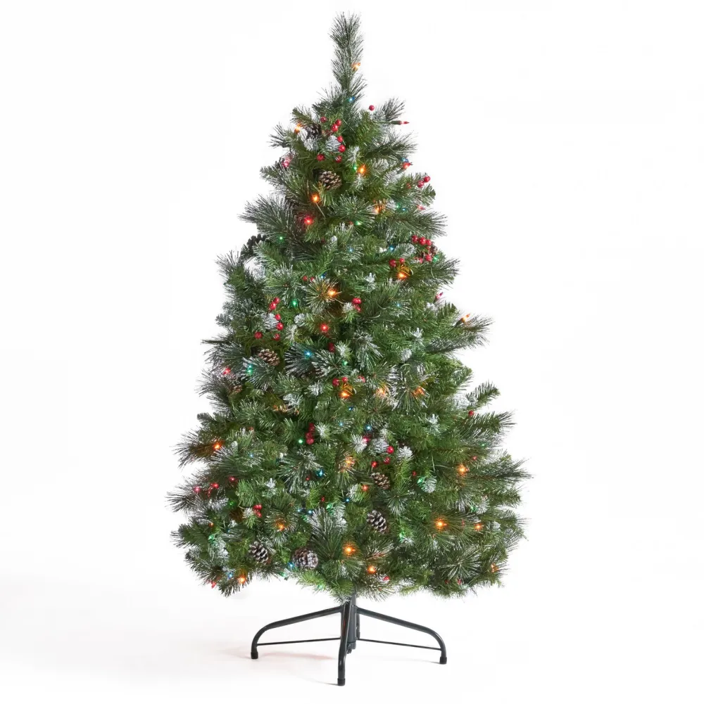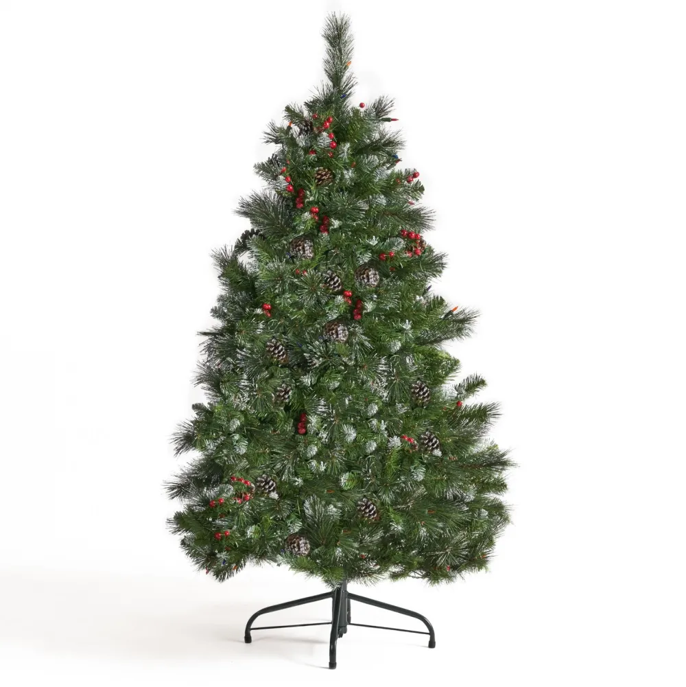 - Mixed Needles: From Its Glitter-Tipped Branches To Its Bright Red Berries And Snow-Powdered Pine Cones, Our Tree Perfectly Captures The Charm Of Christmas. Featuring A Gorgeous Mix Of Pine And Fir Needles, This Tree Is Finished With Natural-Looking Tips And Hinged Branches For All Of Your Ornaments. Please Note That This Accessory Is Intended For Indoor Use Only.