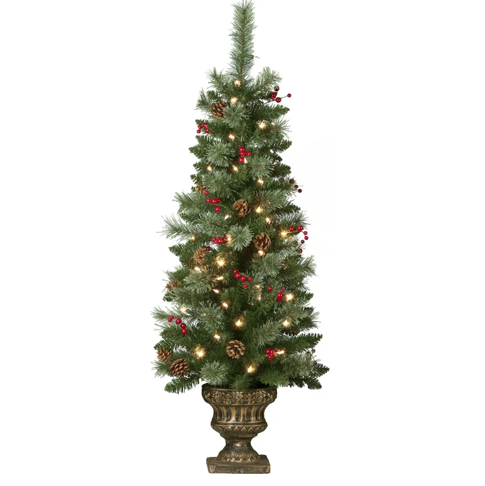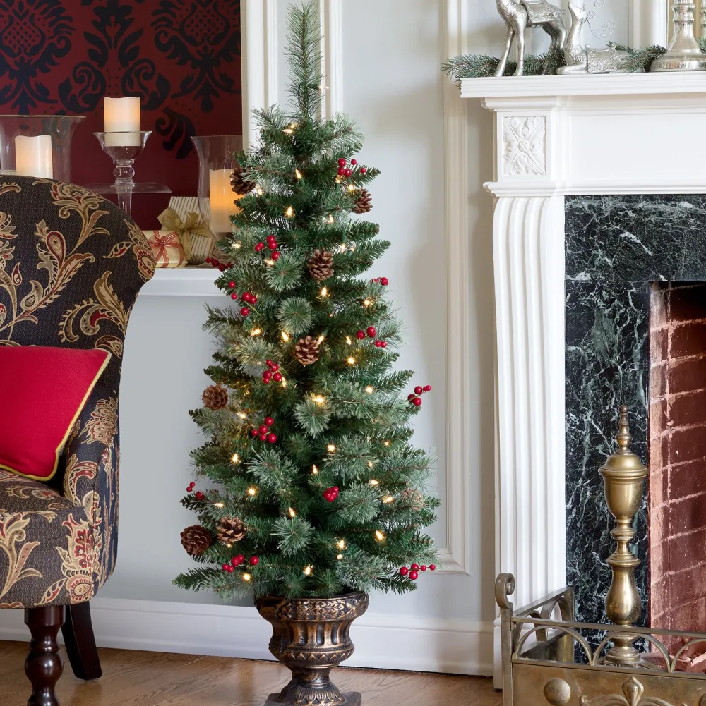 This Mini Faux Christmas Tree Comes Decked Out With Wintry Accents And Sparkling Lights To Make Any Corner Of Your Space Feel Festive. It’s Crafted From Artificial Materials With Realistic Pvc Green Needles, Bright Red Holly Berries, And Flocked Pine Cones That Look Like They’Re Dusted With New-Fallen Snow. This 4′ Holiday Tree Comes Pre-Lit With 80 Warm, Clear White Lights For An Extra Touch Of Sparkle. Plus, It Comes With An Elegant, Bronze-Finished Pot That’s Great On Its Own Or With The Tree Skirt Of Your Choice (Sold Separately).